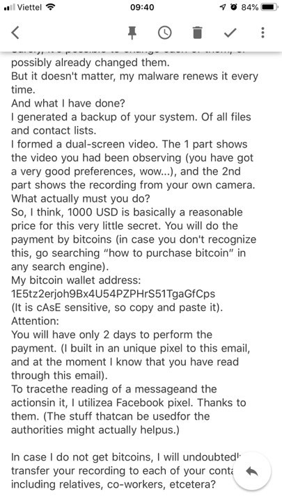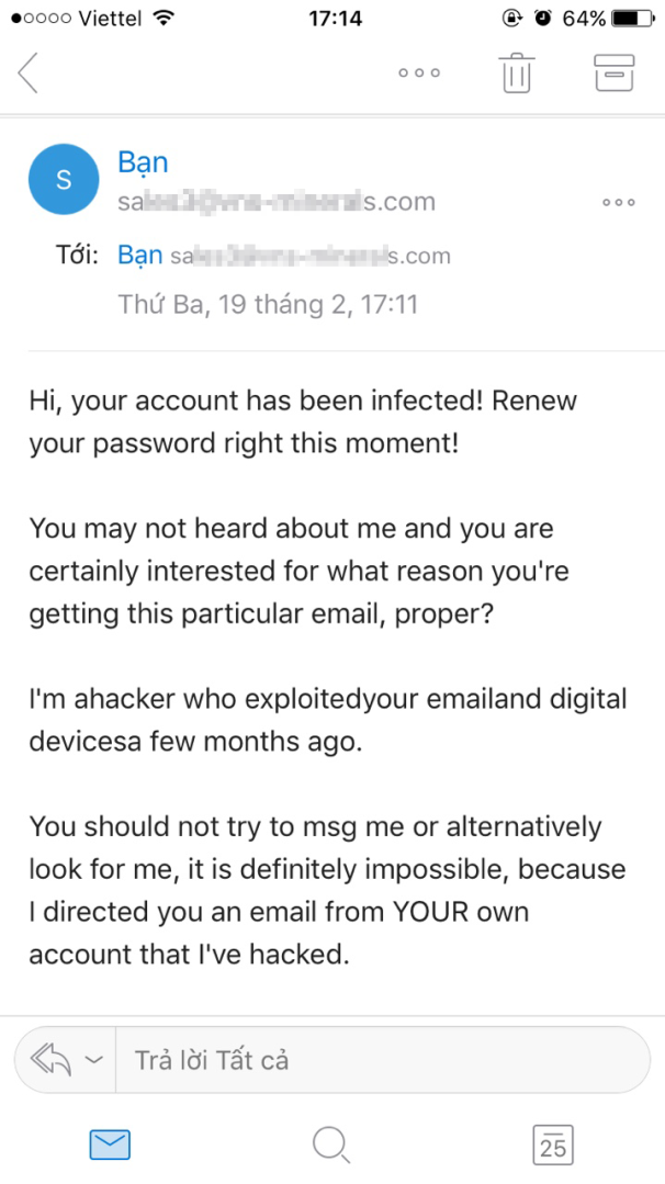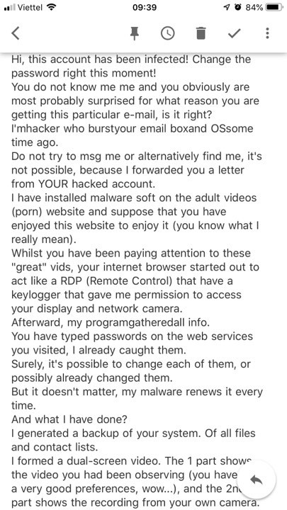 Tôi là một hacker đã xâm nhập vào địa chỉ email và thiết bị số của bạn từ vài tháng trước. Bạn không nên cố gắng nhắn tin hay tìm kiếm tôi vì điều đó là không thể, bởi vì tôi đang gửi email cho bạn bằng chính tài khoản của bạn mà tôi đã hack được”