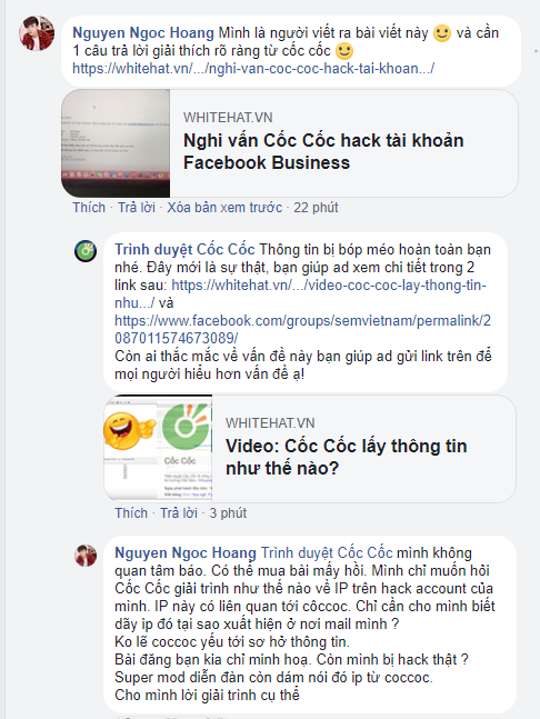 Nick cầm business của em thì không 1 ai biết kể cả người thân cận em nhất. Nick bảo mật rất kỹ, xác thực sđt khi đăng nhập, Không truy cập trên máy tính lạ và không có bất kỳ ứng dụng truy cập phần mềm thứ 3 nào. Ấy vậy mà em bị hack, trong lúc em chưa hiểu tại sao mất sạch fanpage, khoảng được 2 tuần sau thì 1 nick cầm busiess khác của bạn em cũng bị hack vì 1 vài lần đăng nhập Cốc Cốc. Kéo theo nhiều tài khoản facebook khác của em bị thêm mail lạ vào.