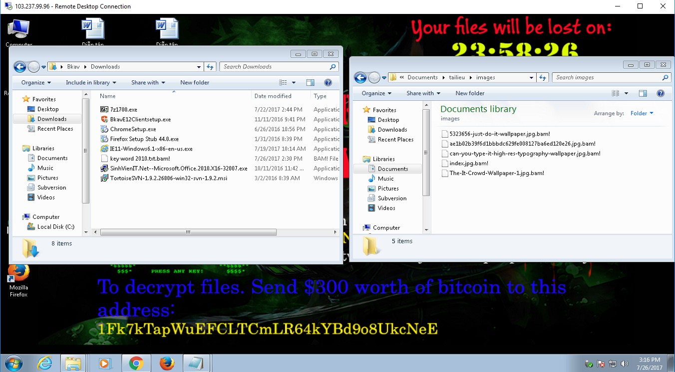 khi chạy các file mã độc, thì các file trong các thư mục documents, downloads, Desktop.. đều bị nhiễm và đổi đuôi thanh .bam!